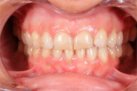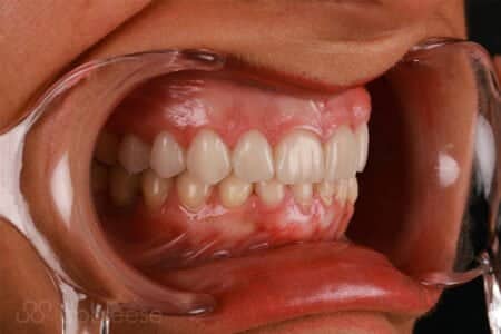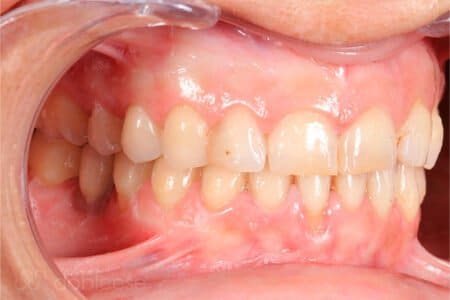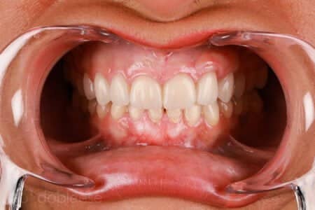 Una vez desinflamados, realizamos una cirugía mucogingival para recubrir las raíces que quedaban expuestas en los caninos y en los dientes inferiores. Con ello, conseguimos situar la encía en sus niveles originales, al mismo nivel que las piezas dentales vecinas, eliminando así la retracción de estas.