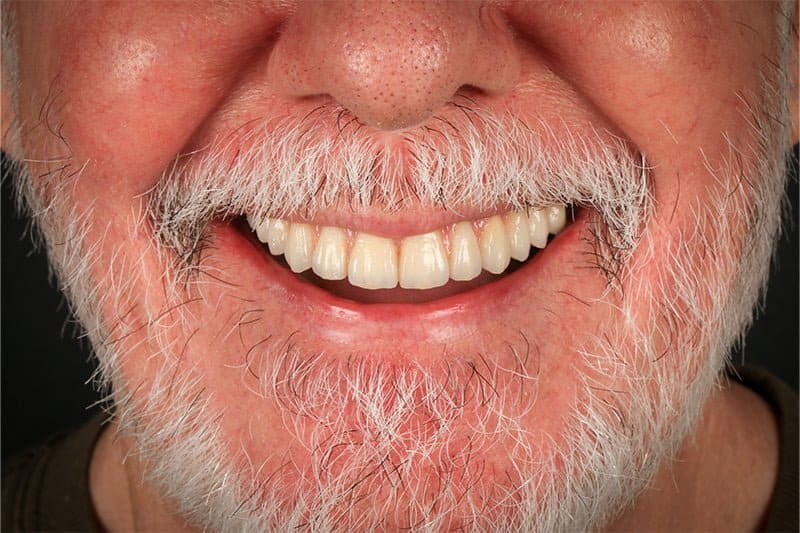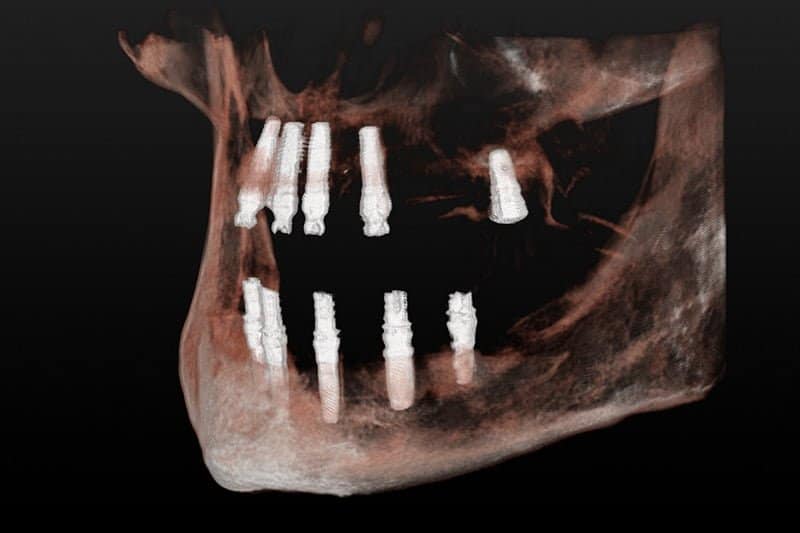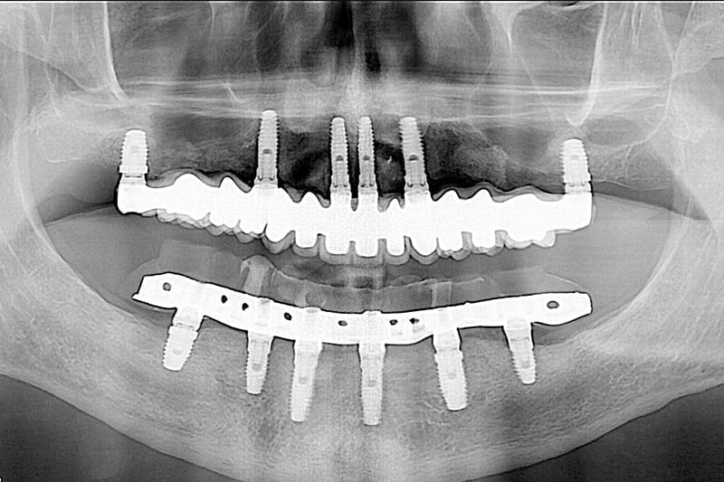 La solución que planteamos para resolver su caso fue una rehabilitación total, en una sola sesión y bajo sedación. Retirando todos los dientes afectados por la periodontitis y los implantes antiguos en mal estado, y colocando en una sola sesión implantes nuevos y saneando todos los tejidos, en el mismo día le colocamos la nueva prótesis fija provisional. Cuando los tejidos curaron y maduraron pudimos terminar con las prótesis definitivas de alta estética.
